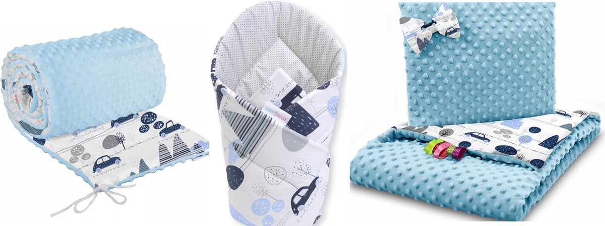 De set is dubbelzijdig met een mooie minky stof aan de ene kant en katoen aan de andere kant. Deken is zonder vulling en niet zwaar, daarom perfect voor pasgeborenen. De set is perfect voor zomeravonden/nachten.