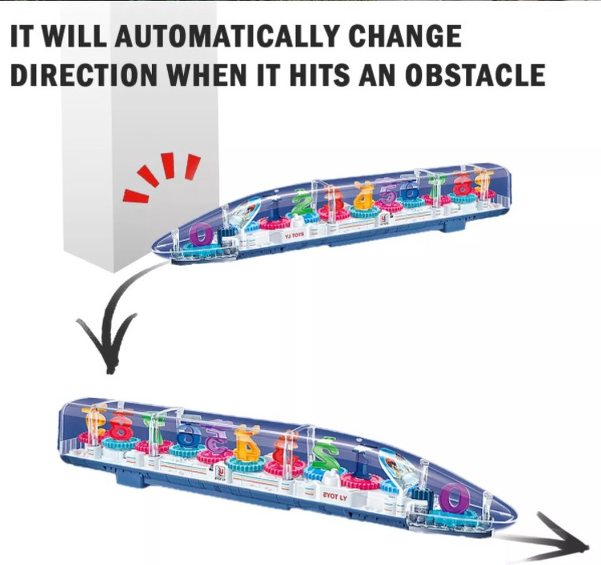 Deze doorzichtige trein kan automatisch veranderen en in de andere richting rollen als hij tegen een muur, tafel of ander object op zijn pad botst. Deze trein is gebouwd met hogesnelheidswielen en prachtige knipperende LED-verlichting.