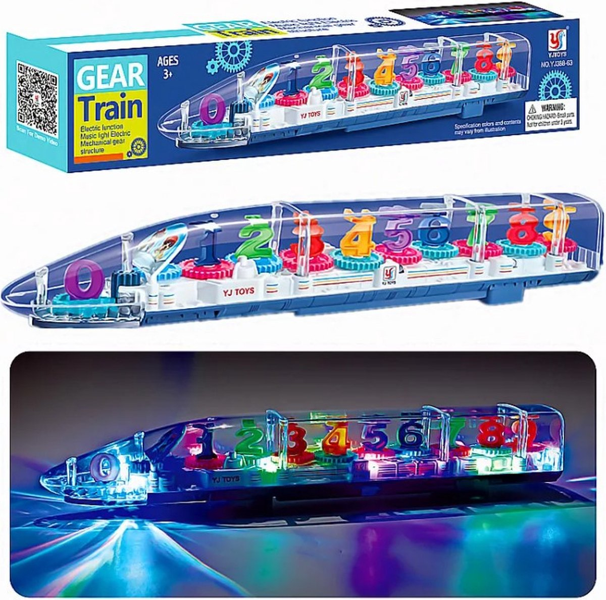 Een multifunctioneel Gear Light-treinspeelgoed met mechanische versnellingssimulatie met transparante schaal, 3D-knipperlichten, verschillende muziek-, claxon- en motorstartgeluiden, 360-graden rotatie en rechtuit bewegende functies