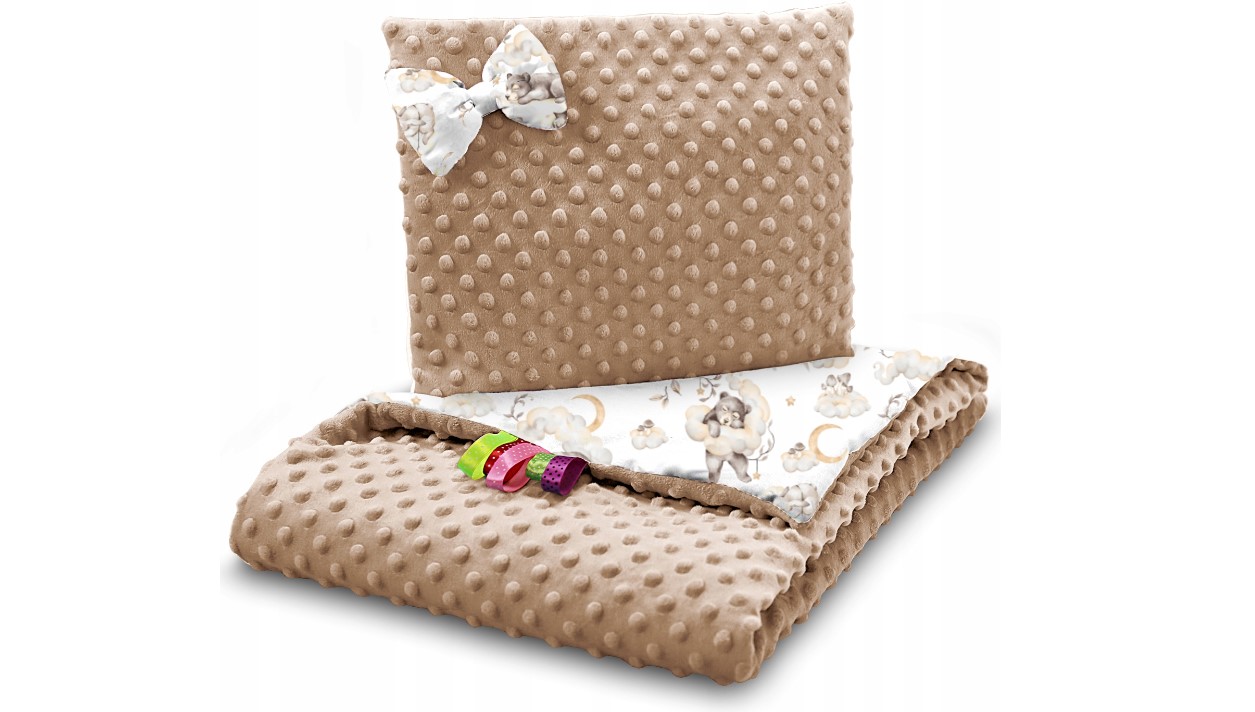 De set is dubbelzijdig, zowel het kussen als de deken zijn dubbelzijdig. Aan de ene kant met een mooie minky stof en aan de andere kant met katoenen stof.