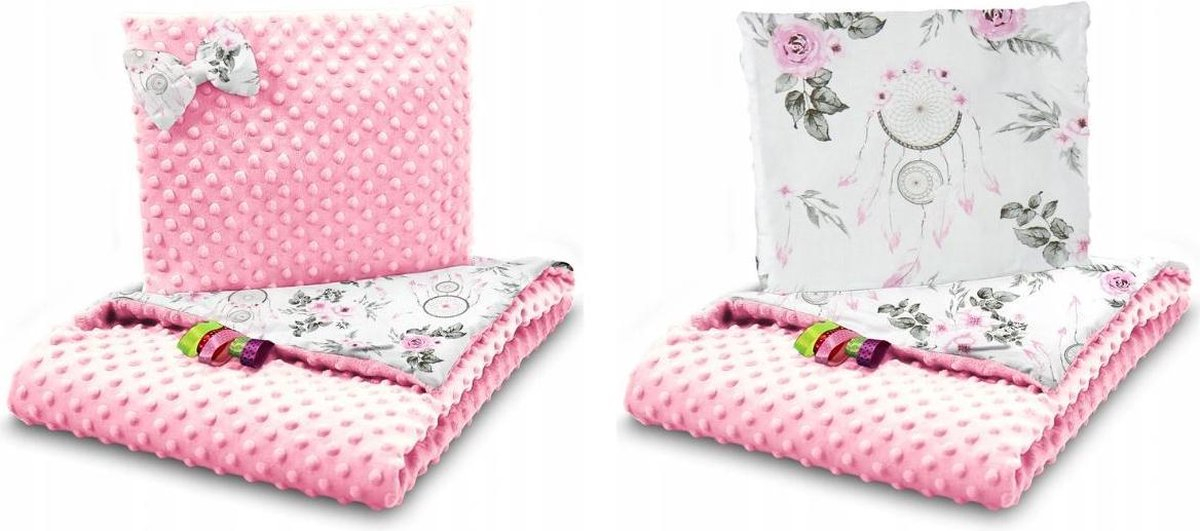 De set is dubbelzijdig, zowel het kussen als de deken zijn dubbelzijdig. Aan de ene kant met een mooie minky stof en aan de andere kant met katoenen stof.