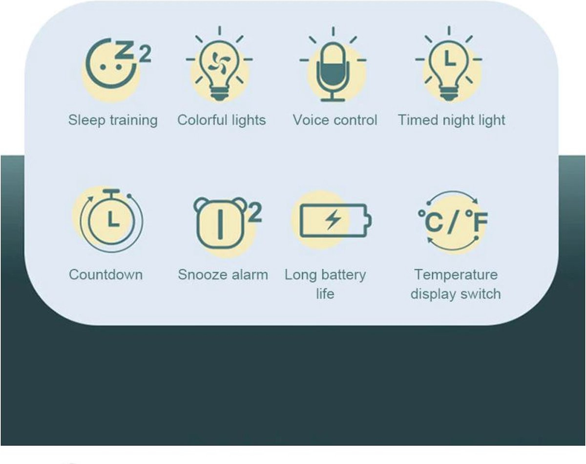 Met deze slaaptrainer zal jouw kind nooit meer te vroeg uit bed gaan of te lang doorslapen! De wekker voor kinderen is voorzien van 6 leuke geluidjes om uit te kiezen en heeft licht dat ‘s ochtends steeds feller wordt. Hierdoor wordt je kind op het gewenste tijdstip wakker en weet je kind wanneer hij/zij uit bed mag. Tik op het lampje om de tijd te laten zien. Zo kan je kindje ook zelf zien hoelaat het is! Of klik op het knopje om te horen hoelaat het is. Hiermee leert je kindje ook nog eens klokkijken!